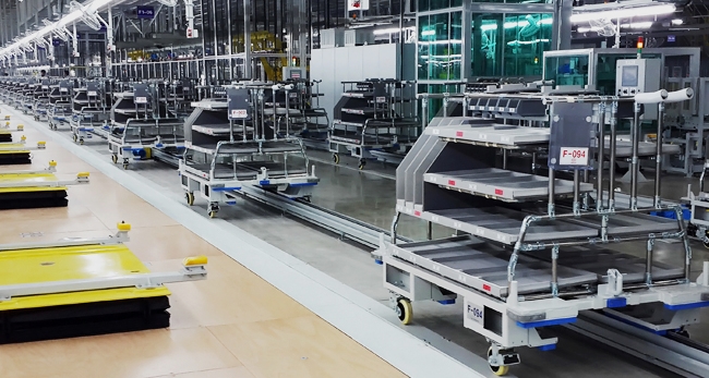 운반 설비란 컨베이어를 중심으로 섀시, 엔진, 도어, 차체 등 각종 자동차 부품들을 생산라인에 최적의 효율로 지속 운반하는 시스템으로 공장의 운영과 생산 효율성 제고에 필수적인 핵심 자동차 생산 물류 설비다.