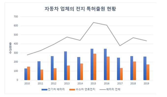 특허청에 따르면, 자동차 업체의 전지 관련 특허출원은 2010년부터 2019년까지 총 4,435건으로서, 2010년 277건에서 2019년 433건으로 56% 증가한 것으로 조사됐다.