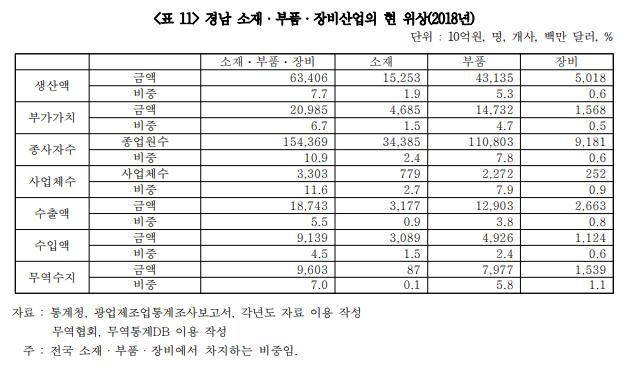 경남은 창원국가산업단지를 중심으로 2018년 기준 부품·장비 산업 생산액이 63조4천60억원으로 전국 부품·장비 산업 생산액의 7.7%를 차지한다. 같은 기간, 종사자 수는 전국 10.9%(15만4천369명), 사업체 수는 전국 11.6%(3천303곳)를 점했다.