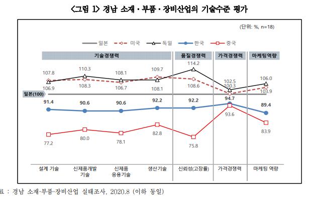 보고서는 경남 부품·장비산업이 2000년대 이후 일본을 제외하고 세계 수출 시장에서 경쟁력을 높여 온 것으로 판단했다. 기술 수준은 일본을 100으로 했을 때 독일은 114.2, 미국 108.6, 우리나라(경남) 92.2, 중국 75.8로 평가했다.