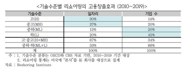 미국은 2010년 95개에서 2018년 886개로, 유럽은 2016~2018년 193개 기업, 일본은 06~2018년까지 7633개 기업이 자국으로 돌아갔다. 보고서는 기업의 기술 수준이 높을수록 리쇼어링으로 인한 자국 일자리 창출 효과가 더 크다고 밝혔다. 미국의 경우 2010~2019년 리쇼어링으로 창출된 전체 일자리 중 고위‧중고위 기술군 일자리가 67%에 달한다고 밝혔다.