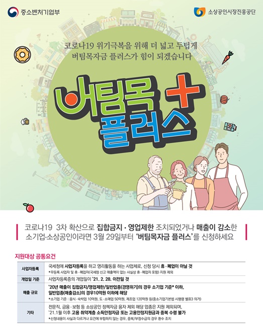 중소벤처기업부(이하 중기부)는 집합금지‧영업제한을 받거나 매출감소로 경영에 어려움을 겪고 있는 소기업‧소상공인에게 3월 29일부터 '버팀목자금 플러스'를 지급한다고 밝혔다.