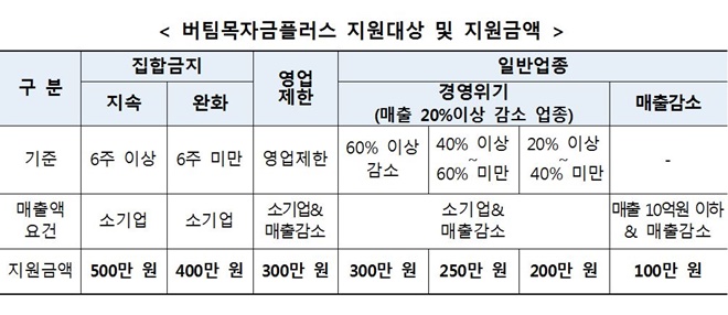 중기부에 따르면 버팀목자금 플러스는 사각지대 최소화를 통해 방역조치 등으로 피해를 입은 사업체를 ‘보다 넓고 두텁게 지원’하도록 설계됐다고 밝혔다.