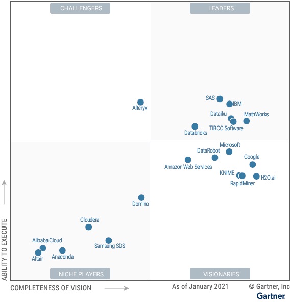 ▲2021년 가트너 매직 쿼드런트: 데이터 사이언스 및 머신러닝 플랫폼 부문 (출처: 가트너)