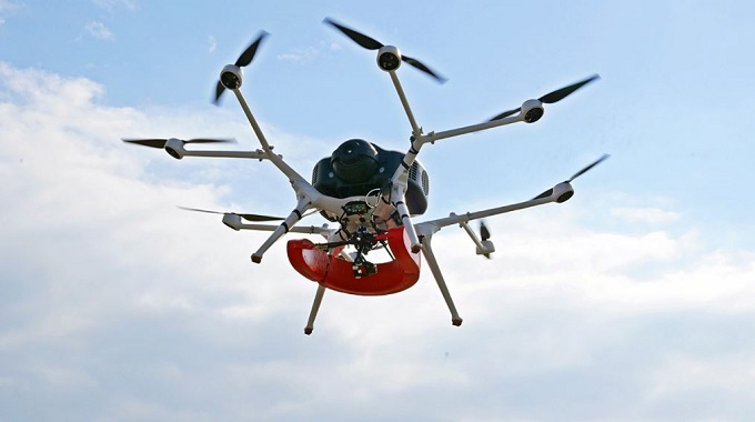 사진. 2시간 이상의 비행시간이 가능한 두산모빌리티이노베이션의 수소드론이 인명구조 비행 시연에서 구명 튜브를 싣고 비행하고 있다.