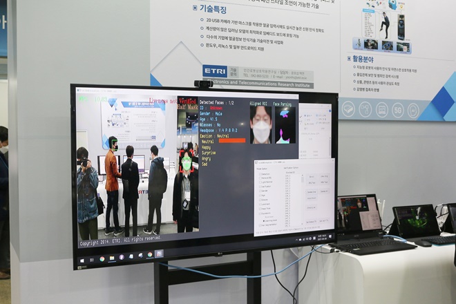 특히 이 기술에서 인식하는 얼굴 정보는 성별, 연령, 시선 등을 넘어 표정, 감정, 거리, 자세 등 더욱 자세하고 면밀한 정보를 추출해 인식한다. 출입관제 보안이나 범죄자 검색, 감염병 접촉자 판별도 가능하다. 국제인공지능대전 2021에 참가한 기업 및 참관객은 ETRI 부스에서 직접 체험 등을 통해 연구진의 기술을 안내받았다.