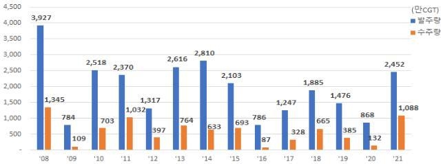 이는 작년 동기 대비 724%, 코로나19 이전인 2019년 상반기보다는 183% 증가한 실적이다. 특히 2006∼2008년 조선 호황기 이후 13년 만에 달성한 상반기 최대 실적이다.