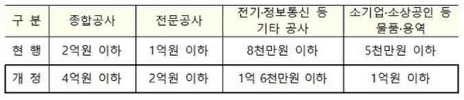 하지만 신속한 계약집행을 통한 경제활력 제고 및 영세기업 참여 확대를 위해서는 특례를 제도화할 필요가 있어 지방계약법 시행령에 소액수의계약 한도를 상향 규정하기로 했다.