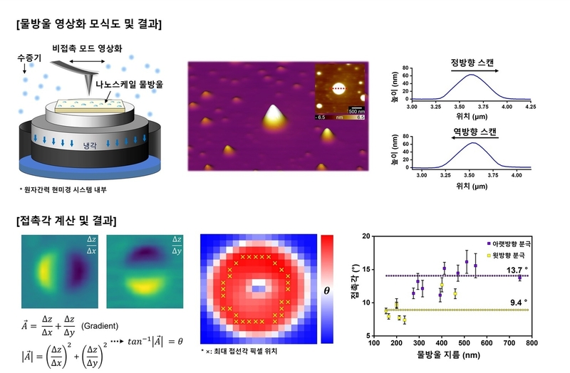 KAIST는 신소재공학과 홍승범 교수 연구팀이 서울대학교 임종우 교수팀과 함께 원자간력 현미경(AFM)을 이용해 나노 크기의 물방울을 실시간으로 직접 관찰하고, 물방울의 모양을 기반으로 접촉각을 계산할 수 있는 기술을 개발했다고 2일 밝혔다.