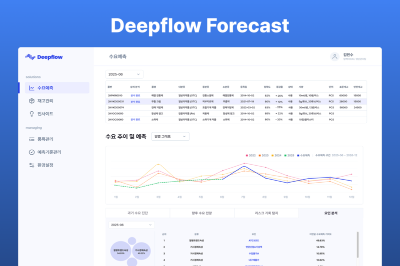 다양한 기술적 성과를 바탕으로 딥플로우의 예측 정확도를 높이는 것을 넘어, 예측을 통해 재고 비용을 줄이고 원자재 구매 전략을 고도화하며 기업의 운영 방식을 근본적으로 개선하는 데 초점을 맞추고 있다. 예측 결과의 원인을 설명하고 실행 가능한 액션 플랜까지 제시함으로써 AI가 현업에서 실제로 활용되고 성과로 이어지도록 만드는 지점이 딥플로우의 본질적인 차별점이다.