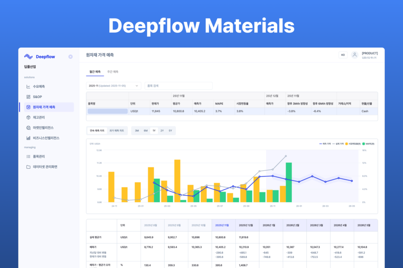 원자재 구매 시점과 가격 결정에 따라 원가 구조가 크게 달라지는 제조 기업에서도 딥플로우를 통해 비용 절감 효과를 기대할 수 있다. 원자재 가격은 유가, 환율, 글로벌 수급, 거시경제 상황 등 다양한 외부 변수의 영향을 받기 때문에, 이러한 변수를 함께 반영한 예측이 구매 전략 수립과 비용 관리의 중요한 근거가 될 수 있다.