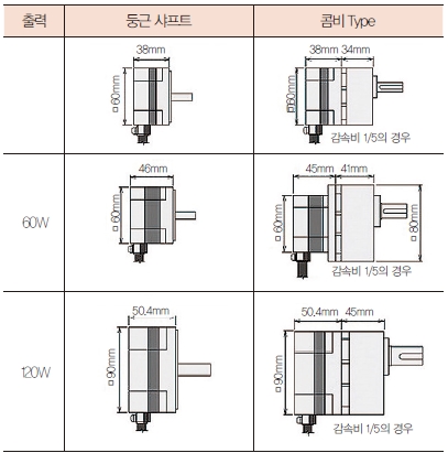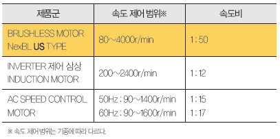 NexBL BMU 시리즈의 출력은 30W·60W·120W의 3종류, 전원 전압 사양은 단상 100V 타입, 단상 200V/삼상 200V 타입의 2종류가 있다. 둥근 샤프트 타입 외에 평행 축 기어 헤드와 콤비 타입으로 된 제품도 준비되어 있다(표 1, 표 2 참조).