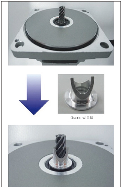그리스 씰 튜브를 추가하여 오일 씰에 의한 부하의 증가를 억제함으로써 모터부의 소형, 고효율을 실현했다.