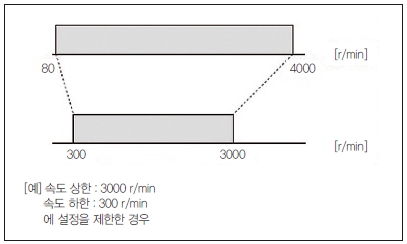 속도 제어 범위는 80r/min에서 4000r/min이고, 장치의 사양에 따라 속도 제어 범위의 상한 값, 하한 값을 설정할 수 있다. 조작 실수 방지 등에 사용할 수 있다(그림 15 참조).