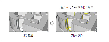 돌출 형상의 경우 조형할 수 없으므로 형상의 변경 또는 별도의 서포트가 필요하다. 언더 컷 부분은 절삭할 수 없으므로 조형한 표면이 그대로 남는다.