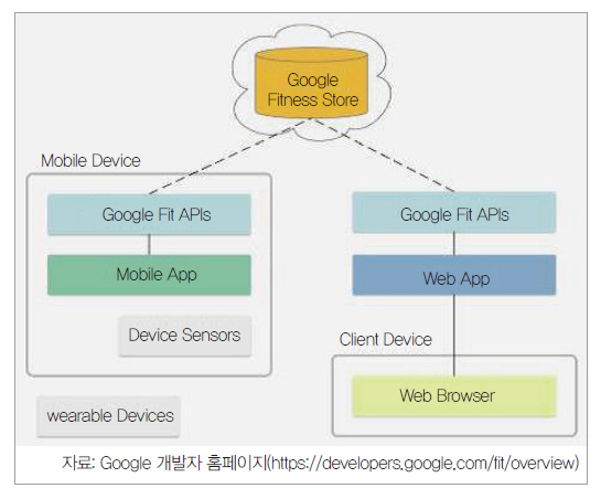 또한, 구글은 2014년 6월 I/O컨퍼런스를 통해 애플의 헬스킷(HealthKit)과 유사한 ‘구글핏(Google Fit)’을 내놓았다. 이의 특징은 애플보다 더 피트니스 분야에 집중되는데(Mobilehealthnews, 2014. 9. 2), 이를 기반으로 구글은 피트니스 스토어에서 유통되는 건강관련 앱들에서 수집된 데이터가 순환되어 다시 이용자들에게 맞춤화된 정보로 제공되게 도와준다.