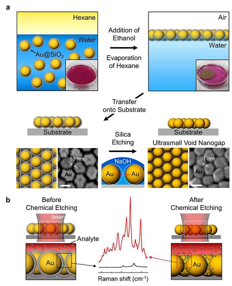 연구팀은 버클리대학교 연구팀과의 국제협력을 통해 손쉽게 균일한 금속 간 초미세간극을 대면적으로 제작했고, 제작한 초미세간극 금속센서를 사용해 초고감도 분자검출 연구를 진행했다. 비효율적이었으며 금속 나노입자들의 자가배열을 이용하는 방법도 금속 나노입자의 특성상 서로 뭉치게 되어, 간극이 아예 존재하지 않는 문제점이 있었다. 연구팀은 기존 기술들의 문제점을 해결하기 위해 금속 나노입자에 껍질을 씌우고 입자를 자가배열한 후 껍질만을 선택적으로 제거하는 손쉬운 방법을 이용해, 1나노미터 크기의 초미세간극을 대면적으로 만드는데 성공했다.