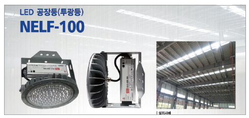 NELF-100은 낮은 소비전력으로 MH250W를 대체할 수 있는 제품이다. 체인, 파이프, 각도 조절 등 고정 방식을 다양화했으며, 5kg으로 제품을 경량화했다. 60℃ 이하의 방열 설계와 무수은, CO₂ 저감, 자외선/적외선 무방출 등으로 친환경적 특징을 갖춘 제품이다.