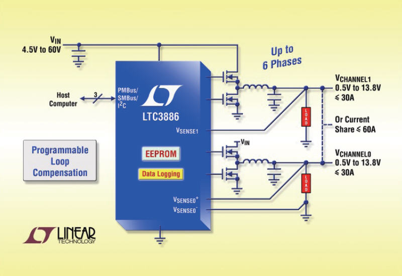 LTC3886은 프로그래밍이 가능한 루프 보정 및 I2C 기반의 PMBus 인터페이스를 탑재한 60V 입력 듀얼 출력 싱크로너스 스텝다운 DC/DC 컨트롤러이다.