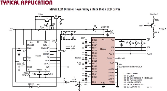 LT3965는 전류 소스로 구성되는 LED 드라이버 회로와 함께 동작한다. 이 제품은 8개의 개별적인 제어형 플로팅 17V/330mΩ NMOS 스위치를 제공한다. 스트링 내에 있는 개별적인 LED들은 내장된 전력 스위치 및 통합 I2C 시리얼 인터페이스를 사용하여, 켜지거나 꺼질 수 있으며, 또는 LED 매트릭스 내에서 독자적인 패턴을 제공하기 위해 PWM(Pulse Width Modulation) 디밍 기능을 수행할 수 있다.