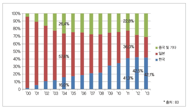 그림 3. 리튬이차전지 국가별 점유율 추이