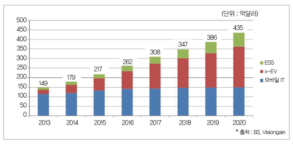 특히 리튬이차전지 시장은 2020년까지 연평균 14% 이상의 성장률을 보일 것으로 예상된다(그림 2). 용도별로 살펴보면, 전기차용 시장이 2020년 약 200억달러 시장을 형성하며 크게 성장할 것으로 전망되며, 모바일 IT용 이차전지는 완만한 성장세를 보일 것으로 전망된다.
