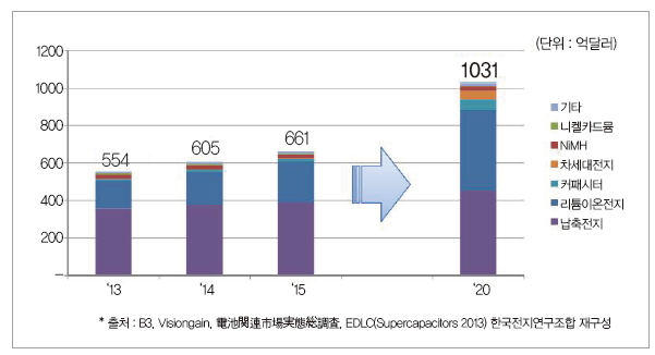 2013년, 이차전지 세계 시장은 550억달러 규모였으며, 납축전지와 리튬이차전지가 전체 시장의 90% 이상을 차지했다. 이차전지 시장은 2013년 554억달러 규모에서, 2015년 661억달러 규모로 성장했다. 오는 2020년에는 1천31억달러 규모까지 성장할 것으로 전망된다(그림 1).