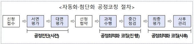 또한, 단계별 코칭지원을 신설해 신청기업이 공정기술전문가(이하, 공정멘티)를 활용해 과제 기획 및 수행 역량을 강화하도록 했다. 공정진단‧기획 코칭은 신청기업을 대상으로 공정진단 및 공정기획을 사전에 코칭하는 것이고, 공정최적화 코칭은 선정기업을 대상으로 자동화 공정 구축 중 발생하는 애로사항해결 및 구축완료 후 공정최적화에 대한 코칭을 지원하는 것이다.