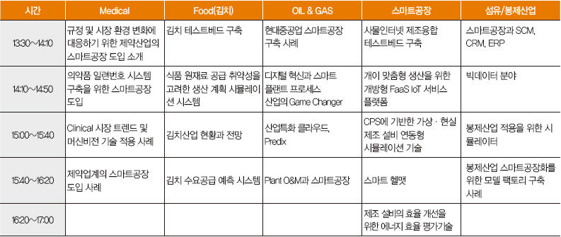 부문별 발표 내용으로는 스마트공장 도입을 위한 단계별 MES 구축 전략, 스마트공장 적용 기술과 도입 방안, 머신비전을 통한 스마트 품질 관리, 스마트공장 공정시뮬레이션 적용 및 센서티브 로봇 적용 사례, 현대중공업 스마트공장 구축 사례, 제약산업 스마트공장 도입 사례, CPS에 기반한 가상·현실 제조설비 연동형 시뮬레이션 기술, 봉제산업 적용을 위한 시뮬레이터 등이 예정되어 있으며, 대기업의 베스트 프랙티스 및 중소·중견기업에 도입 가능한 스마트공장은 어떤 것들이 있는지를 사례와 함께 소개된다.