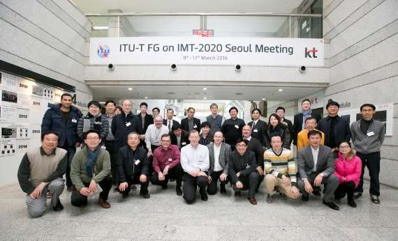▲ 2016년 ITU 전기통신표준총국 산하 IMT-2020 포커스 그룹 회의에서 의장 피터 애쉬우드(Peter Ashwood, 맨앞 가운데 회색 재킷), KT 김형수 박사(앞줄 왼쪽 두 번째) 등 IMT-2020의 5G 전문가들이 모여 기념사진을 찍고 있다. (사진: KT)