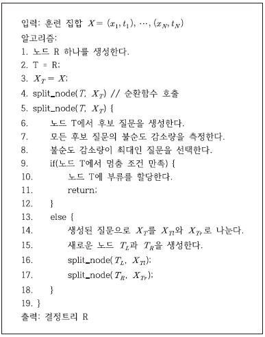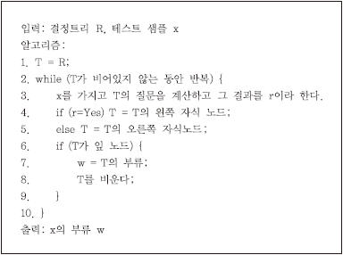 그림 5와 그림 6에는 각각 결정트리 학습 알고리즘과 결정트리 인식 알고리즘이 간략히 정리되어 있다.