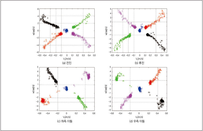 는 각각 휠 #1, #2, #3, #4의 속력을 나타낸다. 메카넘 로봇은 전진 이동 시 시험운동에 대해서 모터의 고장 위치를 정확히 진단하는 것을 확인할 수 있다. 여기에는 지면상 나타내지 않았지만 후진, 우측 및 좌측의 경우에도 정확히 진단하는 것을 확인했다.