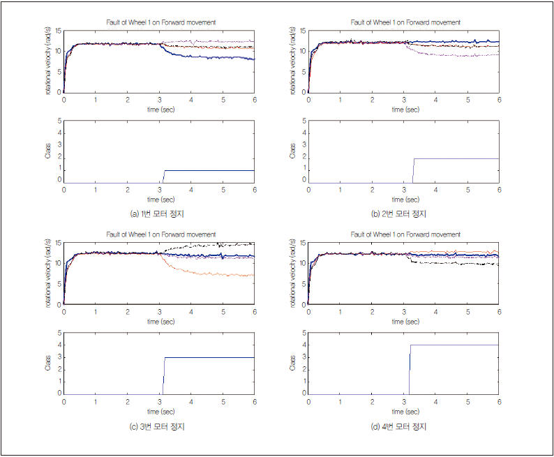 학습된 결정트리가 메카넘 로봇의 구동부 고장위치를 정확히 진단하는지 실험을 통해 평가하기로 한다. 실험은 약 3초 동안 정상적인 상태로 전진으로 이동하다가, 그 이후 각 모터에 전원이 입력되지 않는 고장 상황을 부여했을 때, 결정트리의 인식 성능을 평가한다. 그림 10은 전진운동 시 모터 고장 진단 성능 평가이다.