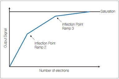 이와 같은 조도 수준의 큰 차이를 수용하기 위해 센서는 세그먼트로 나눈 변환 특성을 프로그래밍하는 특수한 기법을 제공한다. 3개의 선형 세그먼트가 로그 변환 곡선을 근사화한다. 이것은 센서의 동적 범위를 90dB 이상으로 확장한다. 또한 그림 2에서 보듯이 조도 수준(전자 수와 같음)이 증가되면서 센서의 감도는 2단계 낮아진다.