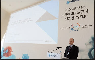 ▲ 다니엘 톰슨 스트라타시스 코리아 지사장이 동대문디자인플라자에서 열린 신제품 발표회에서 J750의 최첨단 기술과 솔루션에 대해 소개하고 있다.
