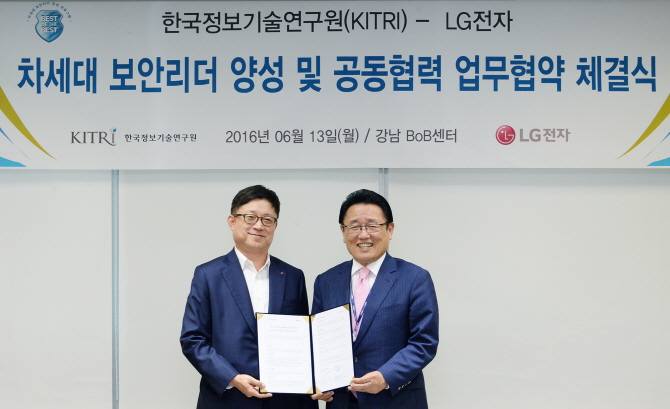 LG전자가 한국정보기술연구원과 손잡고 화이트 해커 양성에 적극 나선다. LG전자와 한국정보기술연구원은 한국정보기술연구원 강남 BoB 교육센터에서 ‘IT 보안 전문가 양성 및 협력에 관한 양해각서(MOU)’ 체결식을 열었다. 이날 행사에는 민경오 LG전자 소프트웨어센터장, 유준상 한국정보기술연구원장 등이 참석했다.