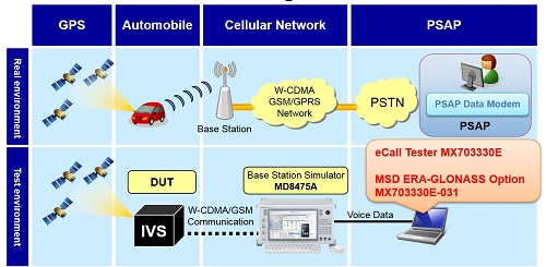 eCall 테스트 기능이 내장된 안리쓰의 기지국 시뮬레이터 MD8475A는 eCall 적합성 테스트 사례의 98% 범위까지 지원 가능하게 됨으로써 시스템 구축에서 핵심적인 역할을 하게 된다.