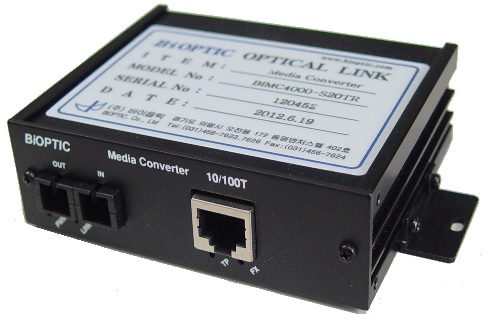 바이옵틱의 미디어 컨버터(BIMC4000 시리즈)는 광섬유를 이용, TP(10/100Mbps)를 광(100BASE-FX)으로 변환해 장거리 전송하는 컨버터이다.