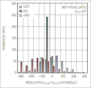 그림 1은 온도에 대한 오프셋 전압과 관련해 LT3744의 생산 일관성을 보여준다. 이 경우 380개의 생산품을 임의로 추출하여 아날로그 제어 입력이 0V일 때에 대한 오프셋 전압을 보여준다.