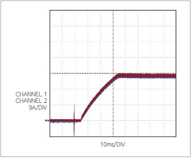 그림 8은 병렬 연결된 두개의 리니어 DC2339A 데모 보드를 사용하는 324W 컨버터를 보여준다. 이 설계에서 각각의 병렬 컨트롤러는 27A를 생성해 6V에서 전체 54A를 생성한다. 대응하는 보상 출력을 같이 연결하면 두 컨트롤러는 함께 동작하면서 매끄럽고 안정된 시동과 정확한 DC 레귤레이션을 제공한다.