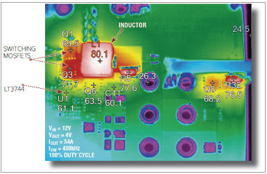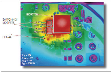 그림 14의 애플리케이션에서 컨버터는 350kHz 동기화 클록과 300kHz의 비동기 주파수에서 동작하도록 설계됐다. 그림 15는 병렬 반전 벅-부스트 애플리케이션에서 LED에 30A를 공급하는 경우 부품의 온도 상승을 보여준다. LT3744는 높은 전류 레귤레이션 정확도, 플로팅 PWM 게이트 드라이버, 레벨 시프트 된 입력 신호 등의 특징을 갖추고 있어 다양한 애플리케이션에서 LED를 구동하도록 구성할 수 있다.