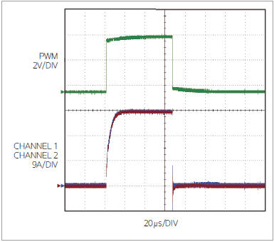 이 애플리케이션에서 두개의 독립 LED 스트링을 전체 54A에서 PWM 디밍 할 수 있다. PWM 디밍할 경우 그림 12는 LED 전류가 2개의 드라이버 간에 완벽하게 공유되는 것을 보여준다. 이 테스트에서 0A에서부터 54A까지 LED에서 전류의 상승 시간은 6.6㎲이다. 각 드라이버의 출력으로부터 LED까지 전기 연결은 각 경로에서 유효 상승 시간을 떨어뜨리는 추가 인덕턴스를 피할 수 있도록 신중하게 평형을 유지해야 한다.