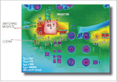 최신 전력 MOSFET을 통합한 효율적인 고전류 LED 드라이버 컨트롤러는 약 4cm²의 솔루션 크기로 약 200W를 제공하며, 모든 전력 경로 부품 온도를 80℃ 미만으로 제한할 수 있다. 200W보다 높은 LED 부하의 경우 LT3744를 다른 LT3744와 병렬로 연결해 특정 부품에서 온도 상승을 제한할 수 있다. 모든 보상 출력은 각 레귤레이터 사이에서 전류를 공유할 수 있도록 병렬로 배치해야 한다.