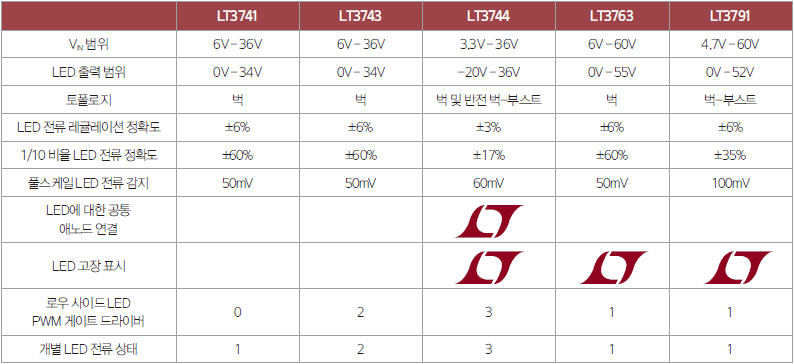 ▲ 리니어의 고전력 LED 드라이버 컨트롤러 제품군 요약