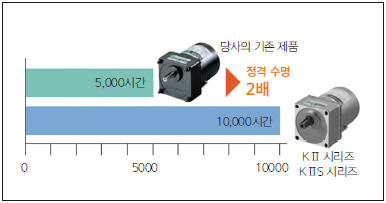 ‘KⅡ·KⅡS 시리즈’의 평행축 기어헤드는 대구경 베어링 채용과 열처리에 의한 기어의 내구성 향상으로 수명을 ‘K 시리즈’의 2배인 10,000시간을 실현했다(그림 8).