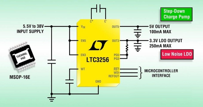 이 디바이스는 5.5V~38V에 이르는 폭넓은 입력전압 범위가 특징이며, 독립적으로 이네이블 가능한 듀얼 출력을 포함하고 있다. 5V 100mA 및 250mA 3.3V LDO(Low-dropout) 레귤레이터로, 총 최대 출력 전류는 350mA이다. 이러한 레귤레이터 조합은 듀얼 LDO 솔루션에 비해 전력 소모가 훨씬 낮다. 예를 들어, 12V 입력에서 두개의 출력에 최대 부하 조건인 경우 LTC3256을 이용하면 전력 소모는 2W 이상 감소되므로 발열과 입력 전류를 대폭 줄일 수 있다.