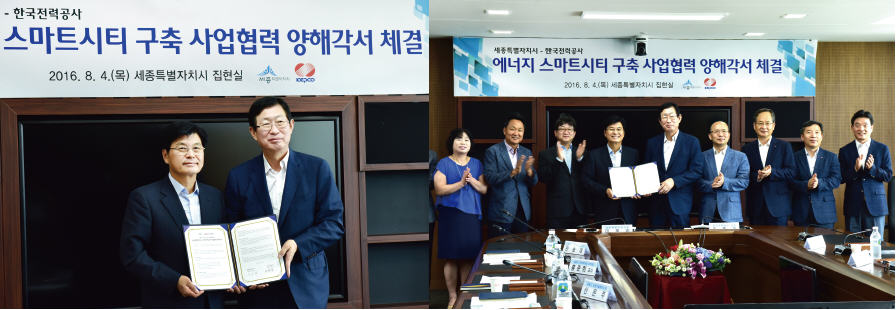 한국전력(사장 조환익)은 최근 세종시청에서 세종특별자치시(시장 이춘희)와 에너지 스마트시티 사업협력 양해각서(MOU)를 체결했다.