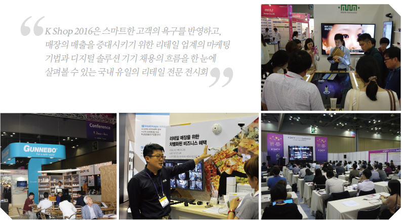 K Shop 2016은 스마트한 고객의 욕구를 반영하고, 매장의 매출을 증대시키기 위한 리테일 업계의 마케팅 기법과 디지털 솔루션 기기 채용의 흐름을 한 눈에 살펴볼 수 있는 국내 유일의 리테일 전문 전시회다.