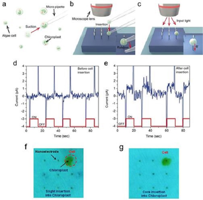 연구팀이 개발한 나노 전극 시스템은 살아있는 다수의 조류세포 자체를 이용해 식물 내 광합성으로 발생한 전자를 추출하는 시스템으로 전류 추출 시 효율과 유지력이 높다.