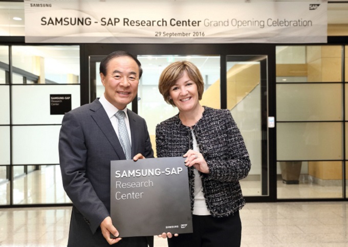 ▲ 29일 진행된 ‘공동 리서치센터’ 개소식에서 삼성전자 메모리사업부 전영현 사장(왼쪽)과 SAP 아시아 태평양 지역 어데어 폭스 마틴(Adaire Fox-Martin) 회장(오른쪽)이 현판을 들고 기념 촬영을 하고 있다. [사진=삼성전자]